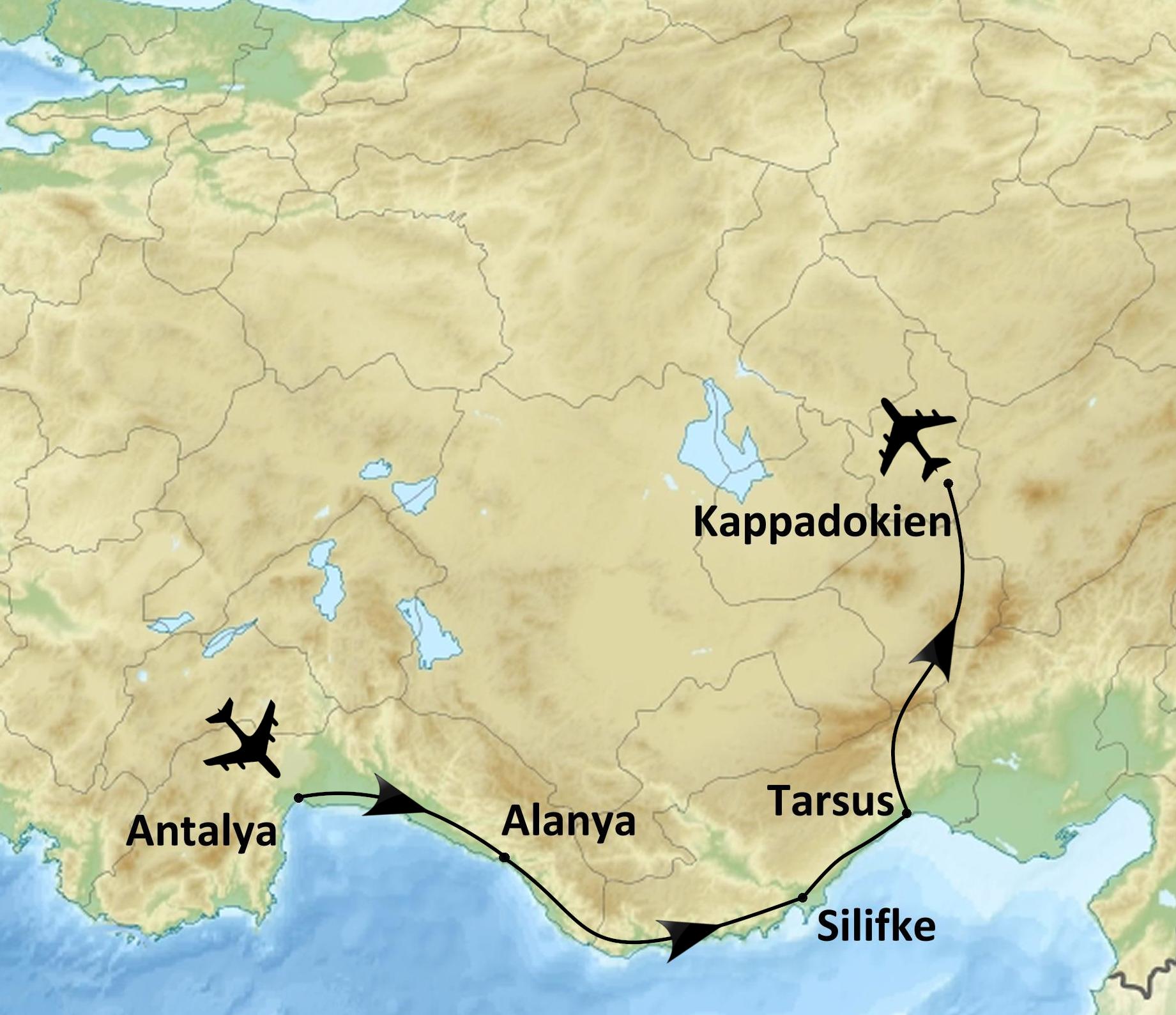 Nach dem Christentum zur offiziellen Religion im römischen Reich erklärt wurde, erfreute es sich einer raschen Ausdehnung auf dem anatolischen Boden. Nach der Aufteilung des römischen Reiches in Ost und West, blieb Anatolien in den Grenzen des oströmischen Reiches, das später zum byzantinischen Reich umgetauft wurde. Dabei ging der Einfluss des lateinischen Erbes zurück und gewann das griechisch christliche Element die Oberhand. Aus diesem Grund beherbergt Anatolien wichtige Überreste der früh christlichen Zivilisation. Auf dieser Route sieht man die Spuren der Christen vor allem in Kappadokien und Kilikien. Zudem erwarten Sie atemberaubende Landschaften in Kilikien und bizarre Formationen in Kappadokien.